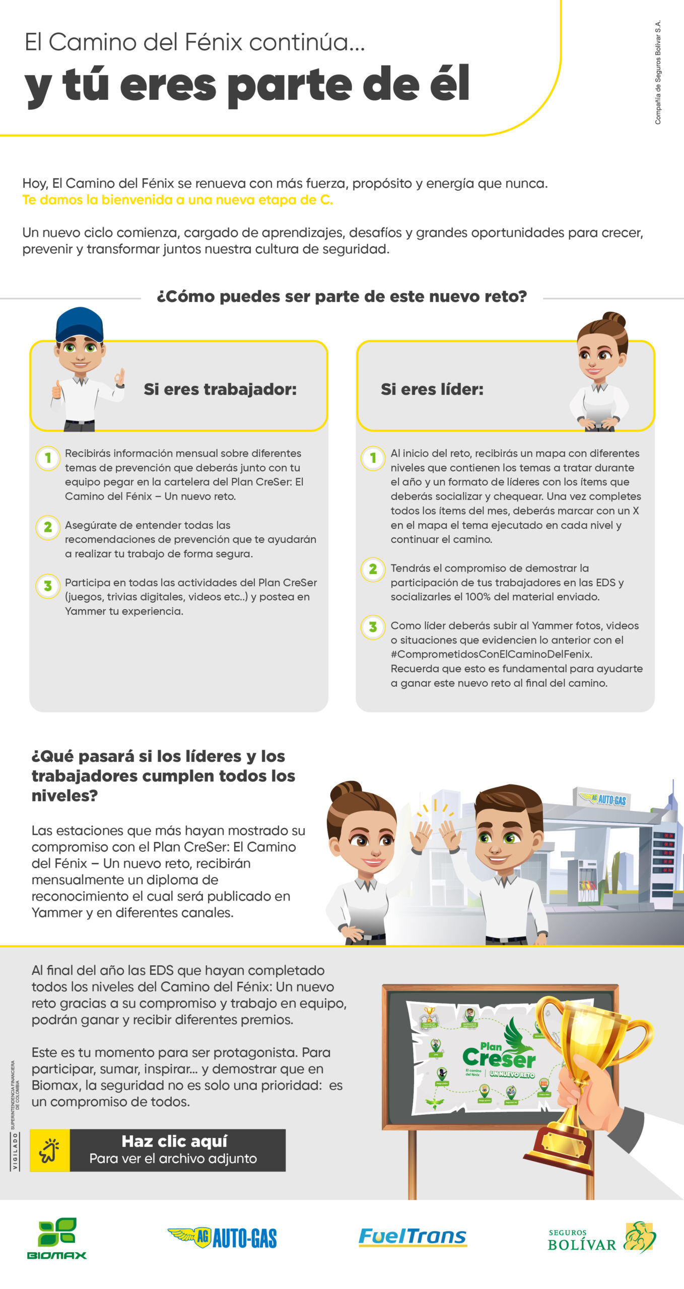 Este año, hemos decidido retomar el camino que nos permitirá renacer y transformarnos. El plan CreSer llega renovado, así como el fénix renace con más fuerza y sabiduría después de cada ciclo, nosotros buscamos promover una cultura donde cada desafío sea una oportunidad para aprender, mejorar y crecer. Queremos adaptarnos a las circunstancias cambiantes y mantener un continuo aprendizaje, tener la capacidad de renacer, de convertirnos en un símbolo de cuidado y autenticidad, fomentando nuestra cultura de seguridad en todos los lugares en los que operamos. Al igual que el fénix cuida de sí mismo, nosotros cuidamos de nuestros equipos de trabajo y del entorno en el que operamos, reconociendo que el cuidado y la responsabilidad, son fundamentales para alcanzar los objetivos de manera sostenible.